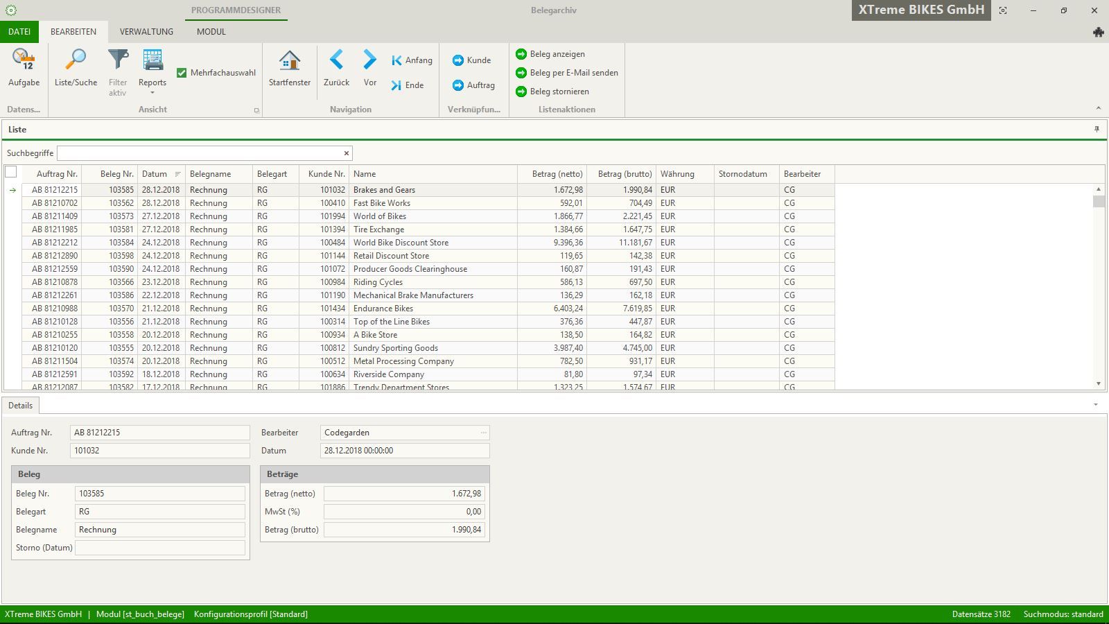 Im Kontor R4 integrierten Belegarchiv werden alle generierten Druckaufträge übersichtlich abgebildet. Die Archivierung erfolgt im PDF-Format. Über die Listenaktionen im oberen Menüband können die Belege angezeigt, versendet, storniert oder gedruckt werden. Die Standardinformationen werden als Listenansicht dargestellt und eine Suche kann über alle Felder erfolgen. Somit finden Sie schnell das gerade benötigte Dokument. Die Dateilinformationen können ebenfalls hier eingesehen werden und per Vernknüpfung gelangt man auf Wunsch direkt zum Kundenstamm oder zum entsprechenden Auftrag.