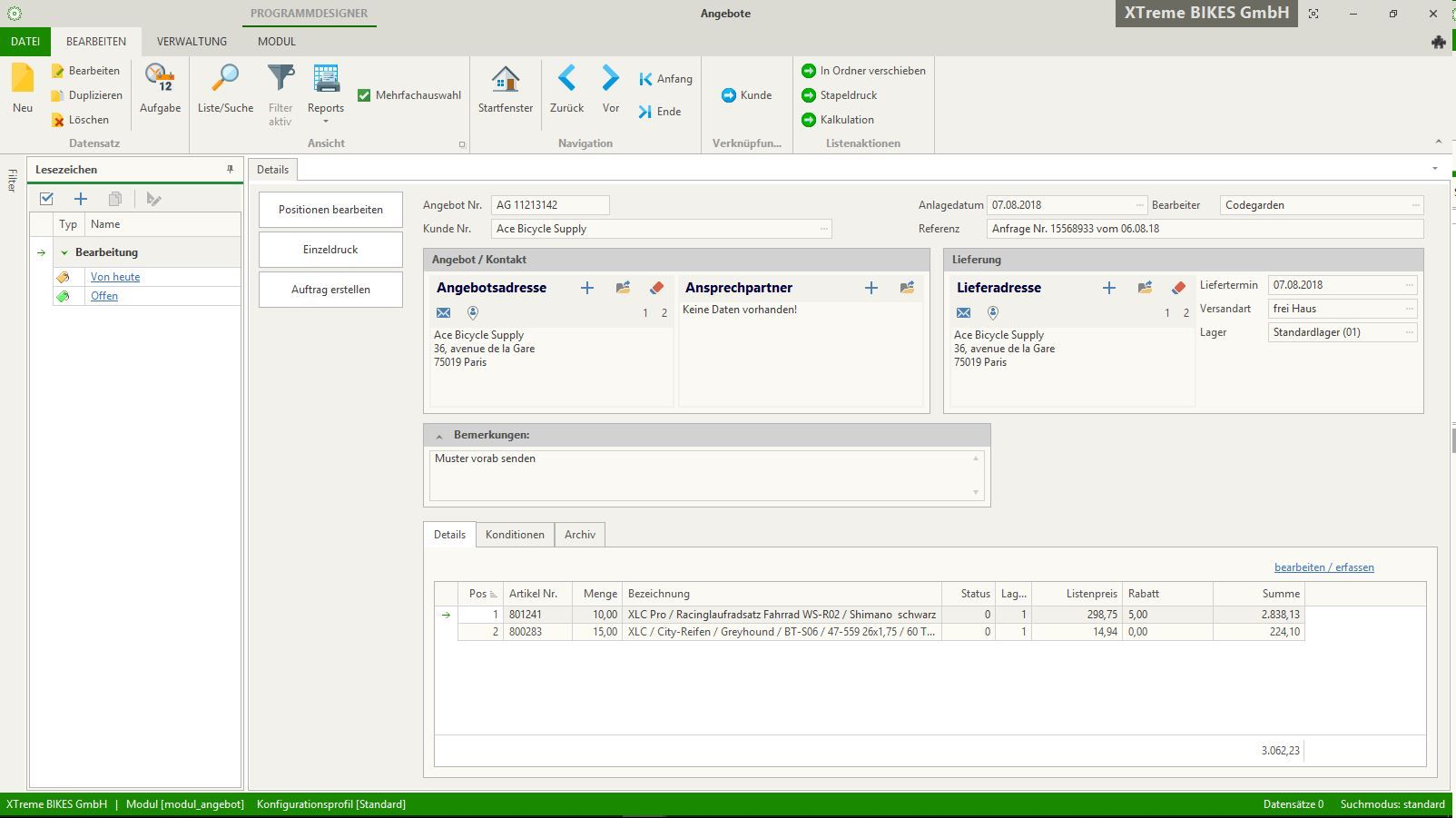 Ein gut organisiertes Ordnersystem hält Sie über die Entwicklungen Ihrer Angebote auf dem Laufenden und überwacht den Status und die Termine Ihrer Angebote. Zu jeder Zeit besteht die Möglichkeit Angebote zu überarbeiten oder zu ergänzen. Erfolgreiche Angebote können problemlos und einfach in Aufträge umgewandelt werden. Dies ist zeitsparend und Fehler bei der Übertragung in einen Auftrag werden dadurch ausgeschlossen. Eine Dokumentation der Gründe warum Angebote vom Interessenten nicht angenommen werden, gibt Raum für Reflexion und Weiterentwicklung.
