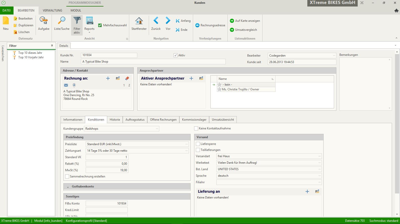 Verschiedene Kunden haben verschiedene Bedürfnisse und verschiedene Bedingungen. Um den Kundenbedürfnissen gerecht zu werden, sind in Kontor R4 alle kundenrelevanten Stammdaten auf einen Blick, übersichtlich organisiert. Den Kundenkontaktdaten können beliebig viele Ansprechpartner zugefügt werden. Hat ein Kunde unterschiedliche Lieferadressen? Die Verwaltung von abweichenden Lieferadressen ist in Kontor R4 Standard. Verschiedene Kunden haben verschiedene Preisgestaltungen. In Kontor R4 können nicht nur globale Rabatte und verschiedene Preislisten für verschiedene Kunden hinterlegt werden, sondern pro Kunde und Artikel entsprechende Sonderpreise. Bei manchen Kunden ist es notwendig, Formulare in ausländischer Sprache zu generieren. Die Auswahl der Sprache ist ebenfalls in den Konditionen im Kundenmodul individuell erfassbar.